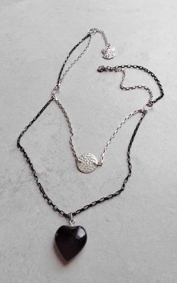 La seconde chaîne, galvanisée noire, accueille un cœur suspendu grâce à une bélière en acier argenté.